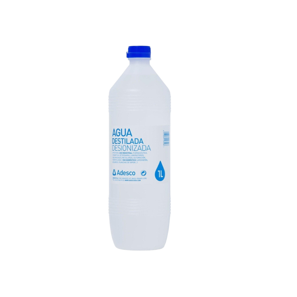 Agua Destilada/Desionizada – Envase de 1 litro Agua purificada mediante procesos de destilación y desionización. Indicada para uso en laboratorios, limpieza de instrumental, autoclaves y otras aplicaciones técnicas.