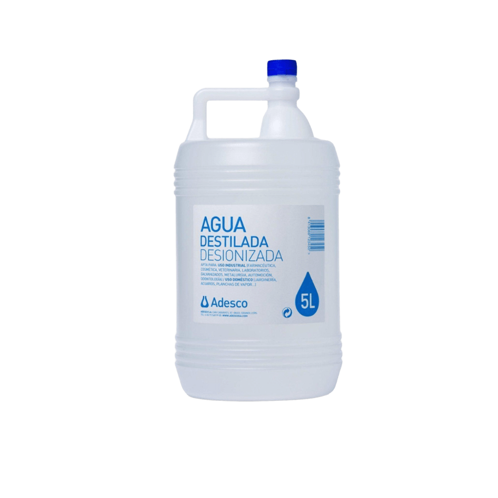 Agua Destilada/Desionizada – Envase de 5 litros Agua purificada por destilación y desionización. Indicada para autoclaves, laboratorios, limpieza de instrumental y uso técnico general. Formato económico de 5 litros.