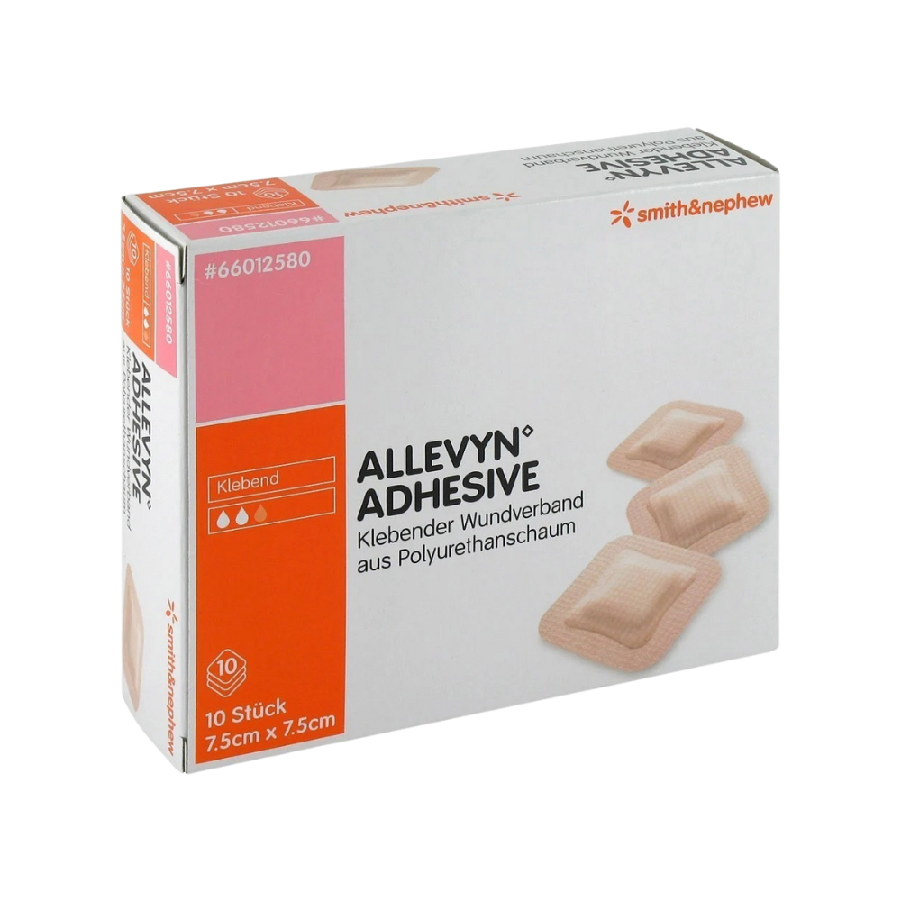 Apósito Allevyn Adhesive 7,5 x 7,5 cm – Protección avanzada y absorción eficaz Apósito multicapa adhesivo, hidrocelular y altamente absorbente. Barrera impermeable y bacteriana, permite el intercambio de vapor de agua. Caja de 10 unidades.