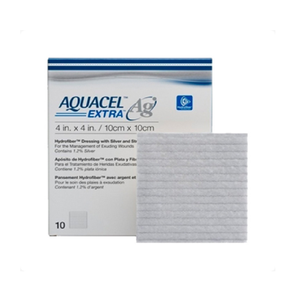 Apósito avanzado AQUACEL® Ag+ Extra, compuesto de hidrofibra con plata iónica, EDTA y cloruro de benzetonio, disponible en varios tamaños. Ofrece alta capacidad de absorción, retención y gelificación, manteniendo un ambiente húmedo óptimo para la cicatrización. Su tecnología Hydrofiber® y fibras reforzantes facilitan la retirada en una sola pieza, mientras su acción bactericida y control de biofilm proporcionan protección superior frente a infecciones
