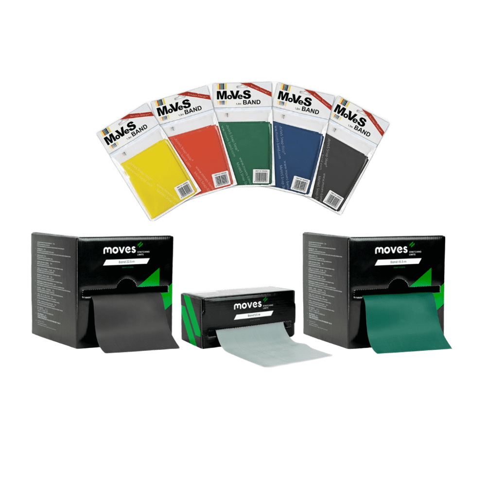 MOVES BAND – Banda Elástica de Resistencia Bandas de látex de alta calidad con tecnología Snap-Stop® que evita el desgarro. Ideales para ejercicios de fuerza, movilidad y rehabilitación. Disponibles en múltiples resistencias, longitudes y presentaciones individuales o en rollo.
