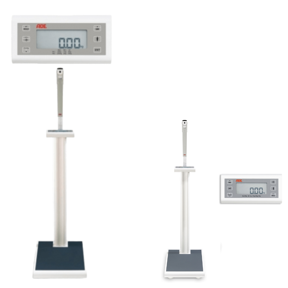 Báscula Electrónica de Columna ADE – Precisión y funcionalidad para uso médico Báscula con plataforma extra ancha, cálculo de IMC, función madre-niño y pantalla giratoria. Ideal para centros médicos y clínicas. Capacidad de hasta 250 kg.