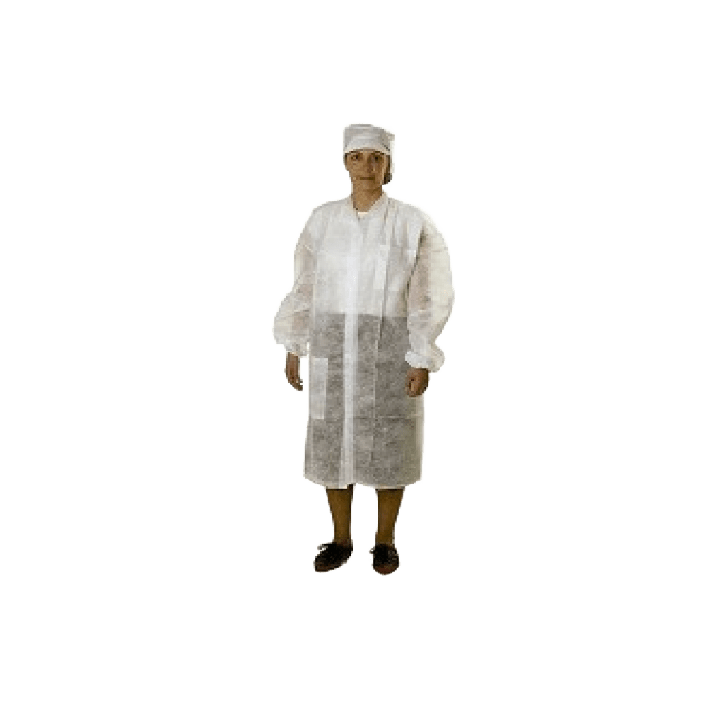 Bata desechable industrial de tejido no tejido (TNT) polipropileno, talla XL, color blanco, con cierre de velcro para ajuste seguro. Proporciona protección ligera e hipoalergénica en sectores industriales, médicos o alimentarios. Caja de 100 unidades. Resistente, suave y de uso único