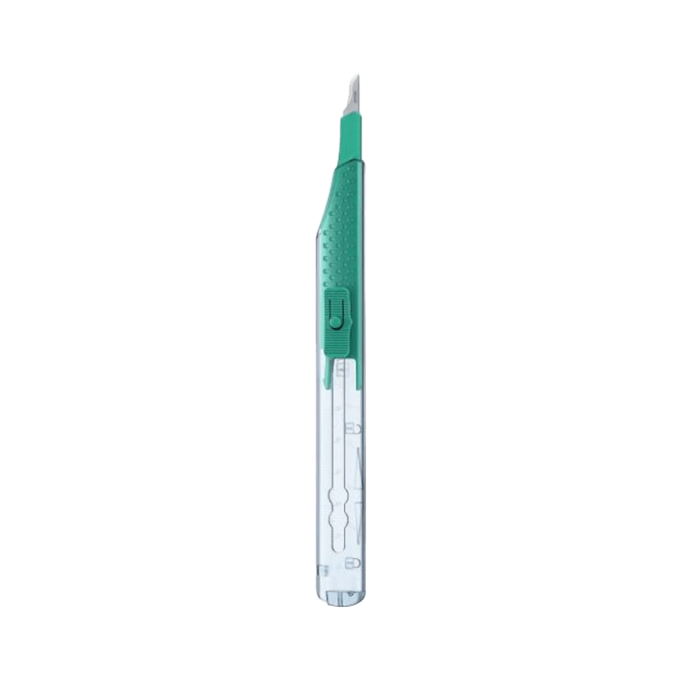 Bisturí de Seguridad Aesculap – Caja de 10 unidades Bisturí estéril de un solo uso con hoja de acero inoxidable, mango de plástico y sistema de retracción protectora para máxima seguridad.