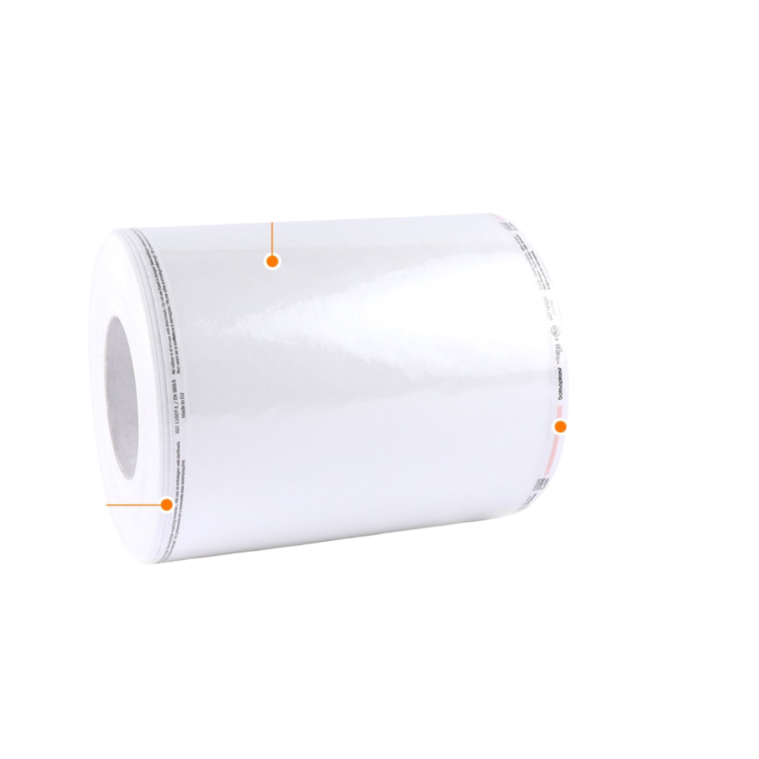 Rollo Tyvek® para Esterilización Rollo de envasado para esterilización a baja temperatura con peróxido de hidrógeno (plasma o vaporizado) y óxido de etileno. Fabricado en Tyvek® 1073B y film, con indicador de proceso para plasma.