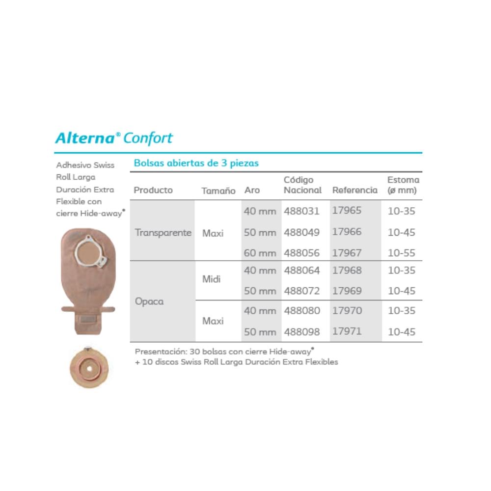 La Bolsa Abierta Alterna® Confort Transparente de 3 piezas con aro Ø 60 mm está diseñada para ofrecer seguridad, flexibilidad y practicidad en el manejo de colostomías. Compatible con discos adhesivos de sistema de tres piezas, se acopla fácilmente mediante un clíper de seguridad que emite un sonido audible al cerrarse, garantizando una conexión firme y confiable. Este modelo cuenta con un sistema de apertura inferior que permite vaciar el contenido de forma rápida y sencilla, sin necesidad de retirar la bolsa. Gracias a su diseño transparente, permite visualizar el contenido para facilitar el control y seguimiento del estoma. Además, su forma ergonómica y materiales suaves aseguran un uso discreto y cómodo durante todo el día. Características principales: Sistema de 3 piezas con aro Ø 60 mm. Bolsa abierta con vaciado inferior práctico e higiénico. Material transparente para mayor control visual. Compatible con discos adhesivos Alterna® Confort. Cierre mediante clíper de seguridad con sonido audible. Presentación: Caja con 30 bolsas. .