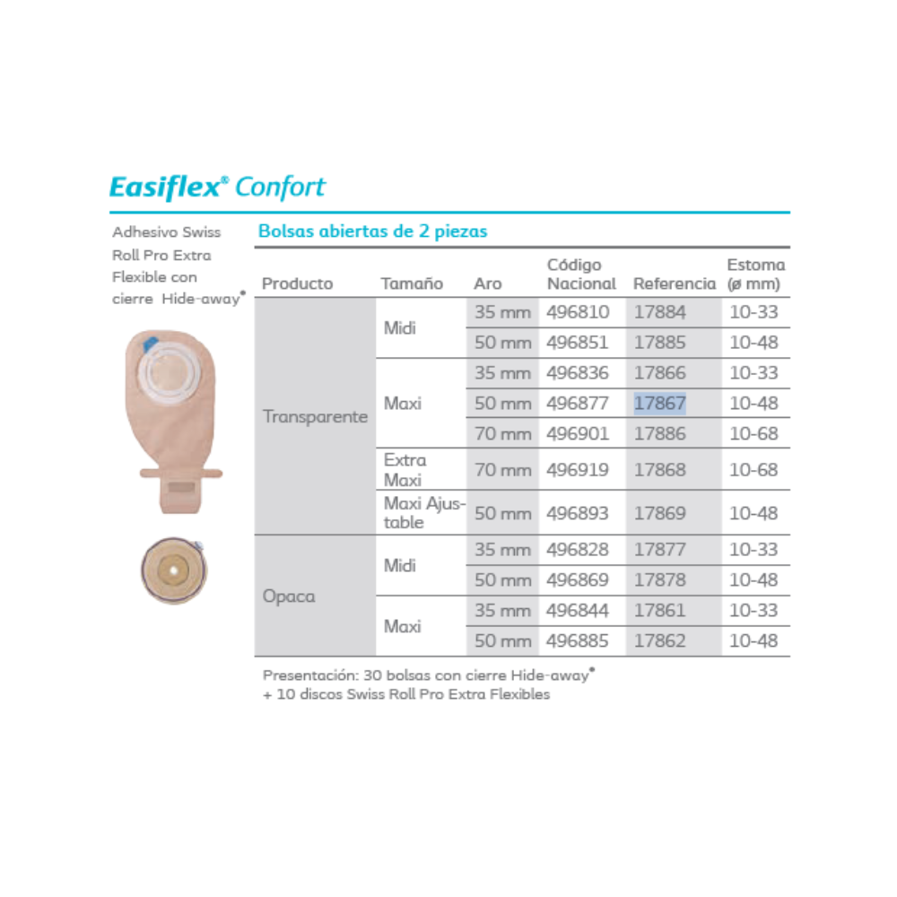 Bolsa abierta transparente para colostomía de sistema 2 piezas, compatible con estomas de 10 a 48 mm. Ideal para heces líquidas o semilíquidas, con cierre sencillo y control visual.
