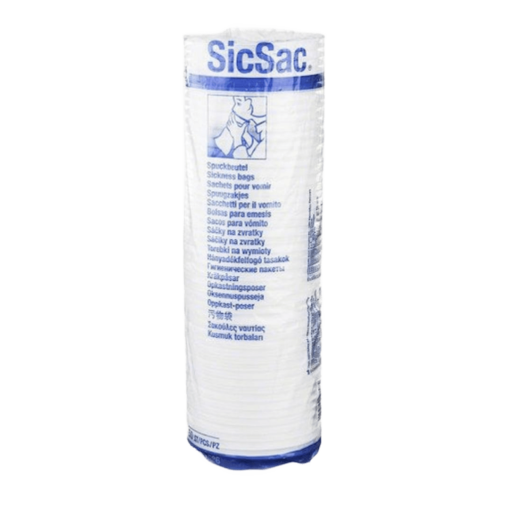 Sicsac – Bolsa para Vómitos con Cierre Seguro y Material Antidesgarro Bolsa para vómitos de un solo uso, con aro de apertura para facilitar su uso. Material resistente, evita derrames y protege la ropa y el entorno.