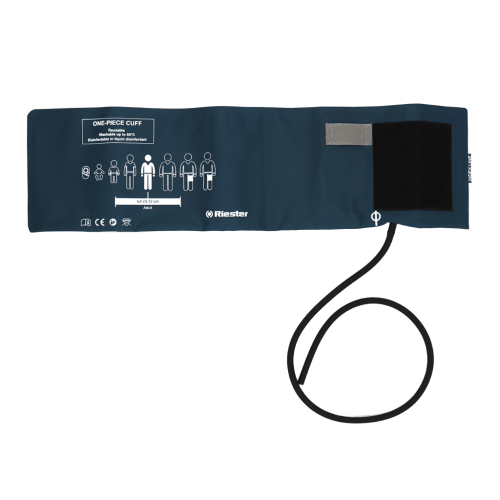Brazalete Adulto Riester – 1 salida Brazalete con velcro y una salida para tensiómetro aneroide. Medidas: 54,5 × 14,5 cm. Fabricado por Riester con materiales de alta calidad.