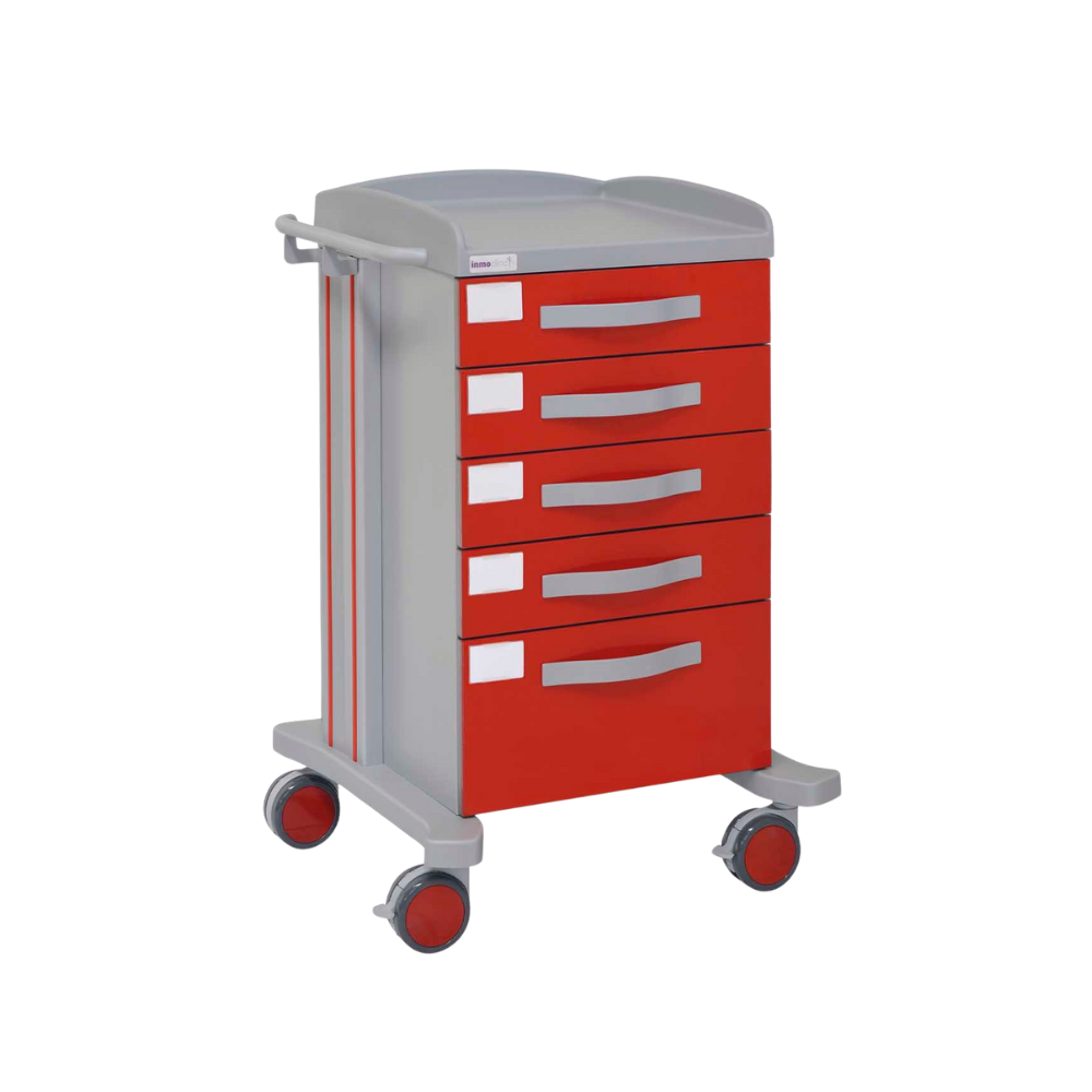Carro hospitalario 5 cajones con empujador rojo – Organización práctica y resistente para uso clínico Estructura robusta en aluminio y acero, cinco cajones con autocierre, empujador lateral, ruedas giratorias y plano superior de ABS para un uso seguro y funcional en entornos médicos.