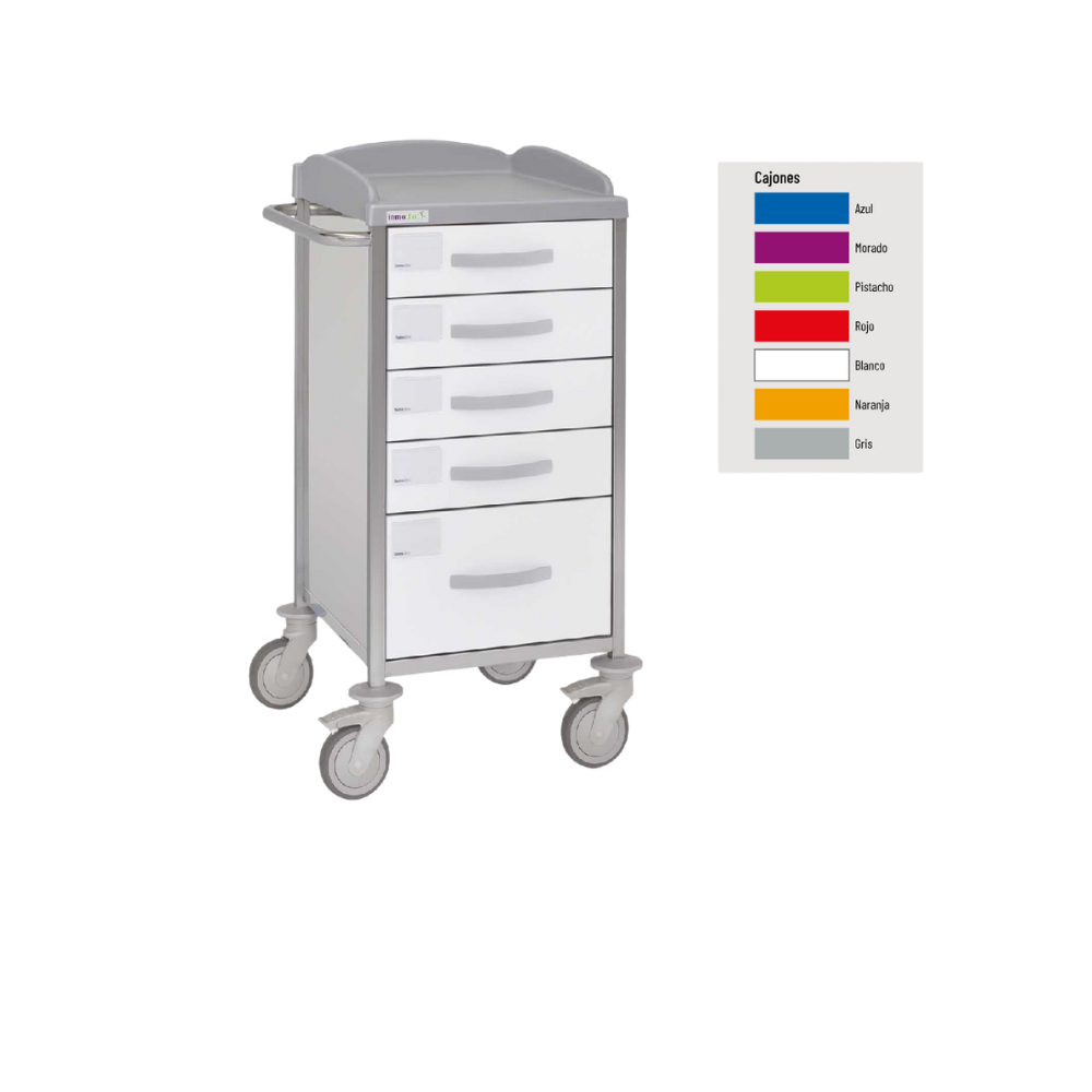 Carro de almacenamiento hospitalario – Organización segura y eficiente para entornos clínicos Este carro de almacenamiento hospitalario está diseñado para ofrecer máxima resistencia, movilidad y organización en hospitales, clínicas o centros de atención sanitaria. Fabricado en acero inoxidable AISI 304, ofrece gran durabilidad y facilidad de limpieza, siendo ideal para zonas donde se requiere un alto nivel de higiene. Su plano superior de ABS con reborde en tres lados proporciona una superficie de trabajo segura para la preparación de material o medicación. Dispone de cinco cajones con sistema de autocierre y apertura del 110%, que permiten un acceso cómodo y rápido al contenido. Los frentes de los cajones están disponibles en varios colores (azul, pistacho, morado, naranja, rojo, gris y blanco), lo que facilita la clasificación de materiales. Cuenta además con porta tarjetas de identificación en color blanco, con opción de personalización en naranja y verde, permitiendo una rápida identificación del contenido. Incorpora un empujador lateral ergonómico para facilitar su desplazamiento. El carro está equipado con protección antichoques y ruedas giratorias anti hilos de Ø 125 mm, dos de ellas con freno, lo que garantiza un movimiento seguro y sin bloqueos, incluso en pasillos estrechos o zonas de alto tránsito. Características destacadas: • Estructura en acero inoxidable AISI 304 • Plano superior de ABS con reborde en tres lados (42,4 x 49,8 cm) • 5 cajones con autocierre y apertura 110% • Frentes de cajón en varios colores: azul, pistacho, morado, naranja, rojo, gris, blanco • Porta tarjetas de identificación (blanco, naranja y verde) • Empujador lateral para fácil desplazamiento • Protección antichoques • Ruedas anti hilos de Ø 125 mm (2 con freno) • Medidas: Largo: 47 cm Ancho: 53 cm Altura: 100 cm Frente cajones (1-4): 41,6 x 11,2 cm Frente cajón (5): 41,6 x 22,7 cm Interior cajones: 33 x 42 x 8 cm .