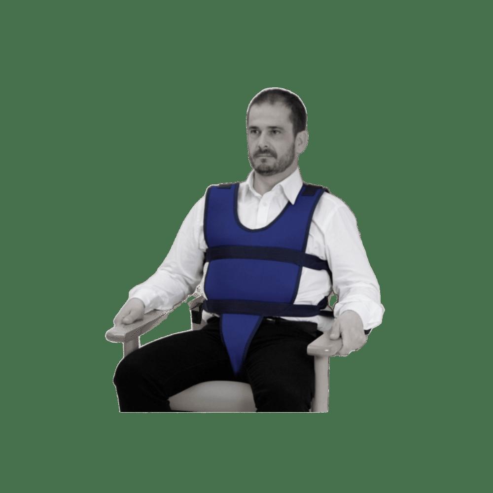 Chaleco de sujeción con banda perineal Chaleco perineal para sujeción de pacientes en sillas de ruedas, con cintas ajustables y cierre posterior, diseñado para evitar deslizamientos.