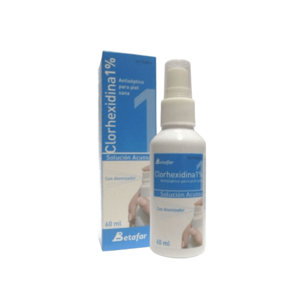 Clorhexidina acuosa Betafar 1% con pulverizador – Antiséptico suave para piel sana Solución acuosa al 1% con acción antiséptica y levuricida. Menor irritación y escozor. Envase de 60 ml. Caja de 24 unidades.