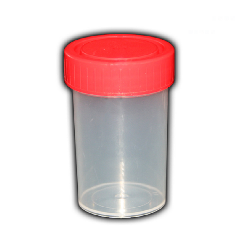 Colector de orina de 120 ml para diagnóstico in vitro, fabricado en polipropileno y tapa de polietileno de alta densidad. Cuenta con boca ancha, paredes transparentes, cierre estanco mediante tapa a rosca roja y graduación cada 20 ml hasta 100 ml. Presentado en bolsa unitaria termosellada, garantiza asepsia y seguridad en la recolección de muestras clínicas