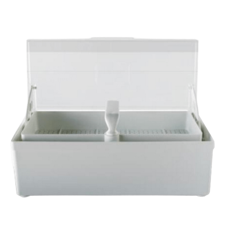Cubeta con Tapa 1,5 L – Limpieza y desinfección por inmersión Recipiente rectangular con tapa y bandeja interior perforada, ideal para procesos manuales de desinfección por inmersión de instrumentos en soluciones químicas.