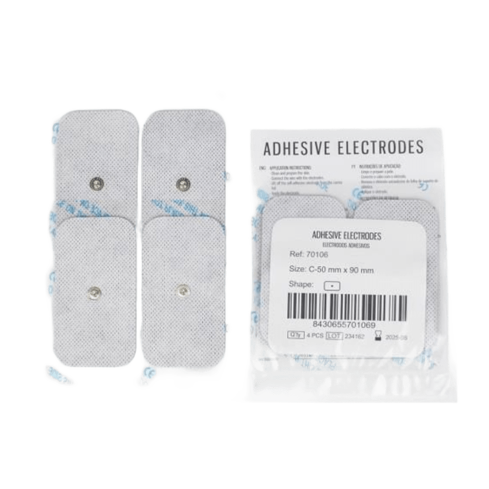 Electrodos Adhesivos para TENS y EMS – Con gel conductor integrado y fácil aplicación Electrodos adhesivos diseñados para aplicaciones de estimulación eléctrica nerviosa transcutánea (TENS) y estimulación eléctrica muscular (EMS). Incorporan gel conductor que mejora la transmisión y facilita su uso sin necesidad de aplicar gel adicional. Fabricados con materiales de alta calidad, como carbono con fibra de refuerzo, y equipados con cable recubierto de PVC (excepto en el tipo Compex). Disponen de conector hembra universal de 2 mm y botón clip Compex de aproximadamente 3,7 mm de diámetro, compatibles con la mayoría de dispositivos estándar. Los electrodos son reutilizables siempre que se mantenga una correcta higiene del paciente y adecuada conservación del producto. Libres de látex y fáciles de aplicar. Características destacadas: • Electrodos adhesivos con gel conductor incorporado • Compatibles con TENS y EMS • Conector hembra universal de 2 mm • Cable recubierto de PVC (longitud aprox. 7 cm) • Carbono + fibra de refuerzo para mayor durabilidad • Pack de 4 unidades, en bolsas individuales (10 packs por presentación) • Botón clip Compex: aprox. 3,7 mm • Reutilizables con mantenimiento adecuado • Libres de látex
