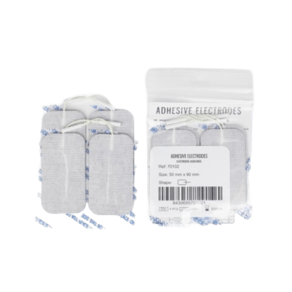 Electrodos Adhesivos TENS 50×90 mm – Alta conductividad y comodidad de uso Electrodos adhesivos de 50×90 mm diseñados para aplicaciones de estimulación eléctrica nerviosa transcutánea (TENS) y estimulación eléctrica muscular (EMS). Incorporan gel conductor que asegura una óptima transmisión de la corriente y una adherencia uniforme sin necesidad de gel externo. Fabricados en carbono con fibra de refuerzo, cuentan con un adhesivo acrílico e hidrogel que facilita su fijación y prolonga la vida útil del producto. El cable recubierto de PVC tiene una longitud aproximada de 7 cm (excepto en el tipo Compex) y conector hembra universal de 2 mm, compatible con la mayoría de los equipos. El botón clip Compex tiene un diámetro aproximado de 3,7 mm. Son reutilizables siempre que se respeten unas adecuadas condiciones de higiene y conservación. Se presentan en packs de 4 unidades envasadas individualmente, con presentación en bolsas de 10 packs. Características destacadas: • Tamaño del electrodo: 50×90 mm • Gel conductor incorporado • Uso indicado para TENS y EMS • Adhesivo acrílico con hidrogel • Cable recubierto de PVC (longitud aprox. 7 cm) • Conector hembra universal de 2 mm • Botón clip Compex aprox. 3,7 mm • Fabricados en carbono + fibra de refuerzo • Reutilizables con higiene adecuada • Libres de látex • Fáciles de aplicar