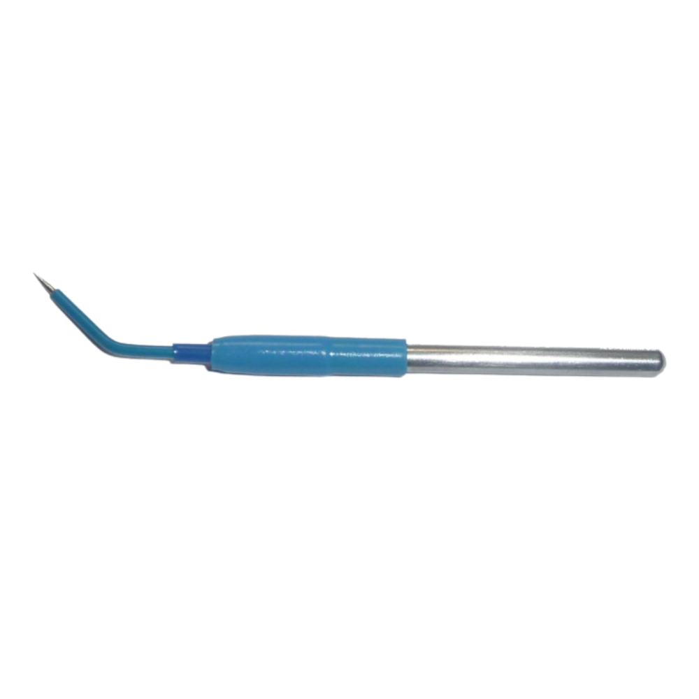 Electrodo Estéril de Tungsteno – 55 mm, Ángulo 45° Electrodo monouso para electrocirugía, con punta de tungsteno y conexión universal. Estéril, de un solo uso, compatible con mangos reutilizables de electrobisturí.