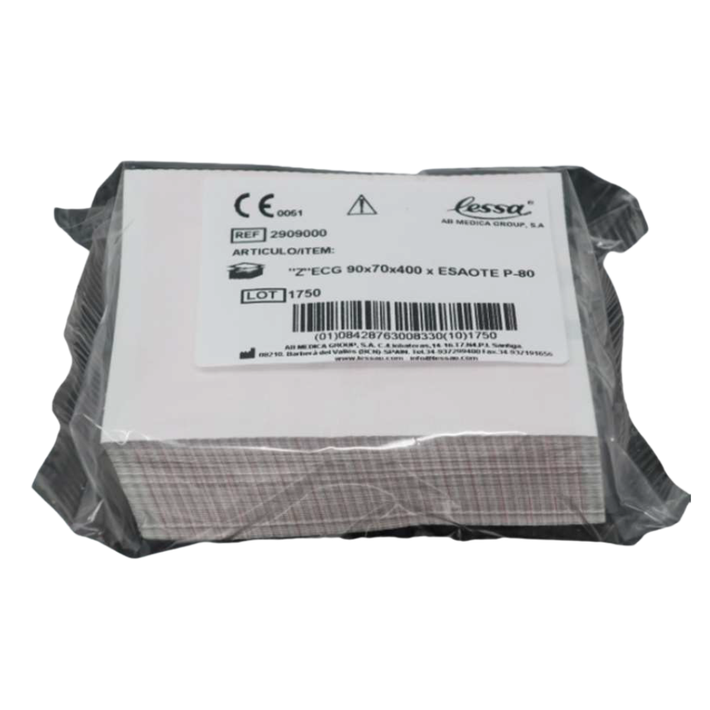 Papel ECG ESAOTE P80 – 90 x 70 mm, Cuadrícula Roja, 400 Hojas Block de papel térmico para electrocardiógrafos ESAOTE P80. Medidas 90 x 70 mm, cuadrícula en rojo. Alta calidad de impresión, ideal para registros precisos.