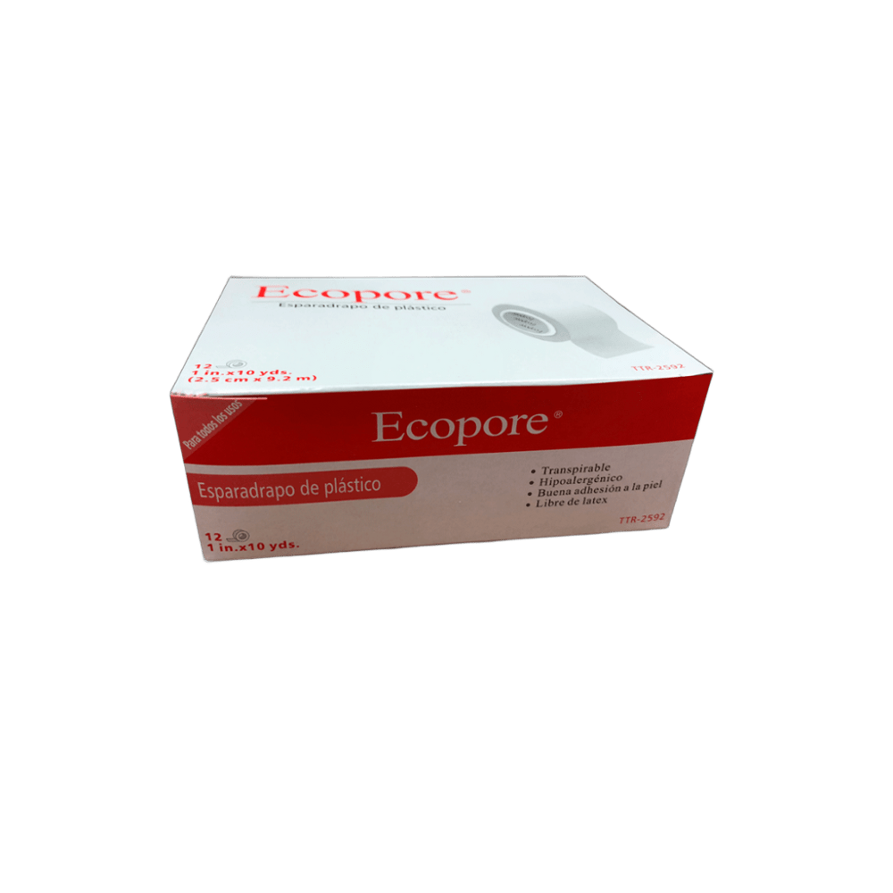 Esparadrapo plástico ecopore UNIDIX – Caja. Esparadrapo hipo alergénico compuesto por una lámina de plástico micro perforado cubierta con adhesivo acrílico, ideal para fijar materiales médicos sin irritar la piel.