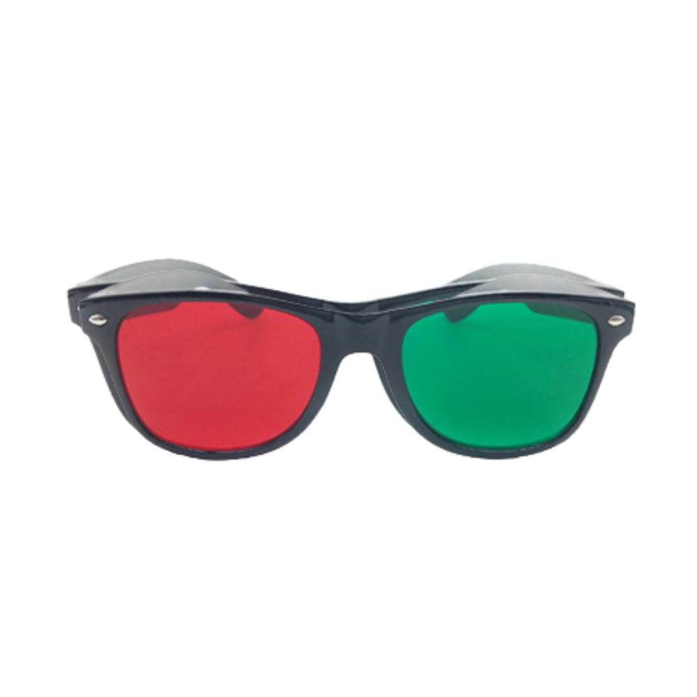 Gafa verde/rojo para TNO adulto – Comodidad, seguridad y ajuste anatómico Gafa anatómica de una sola pieza, fabricada en material plástico flexible y biomédicamente seguro. Sin componentes metálicos y con cinta elástica de fijación.