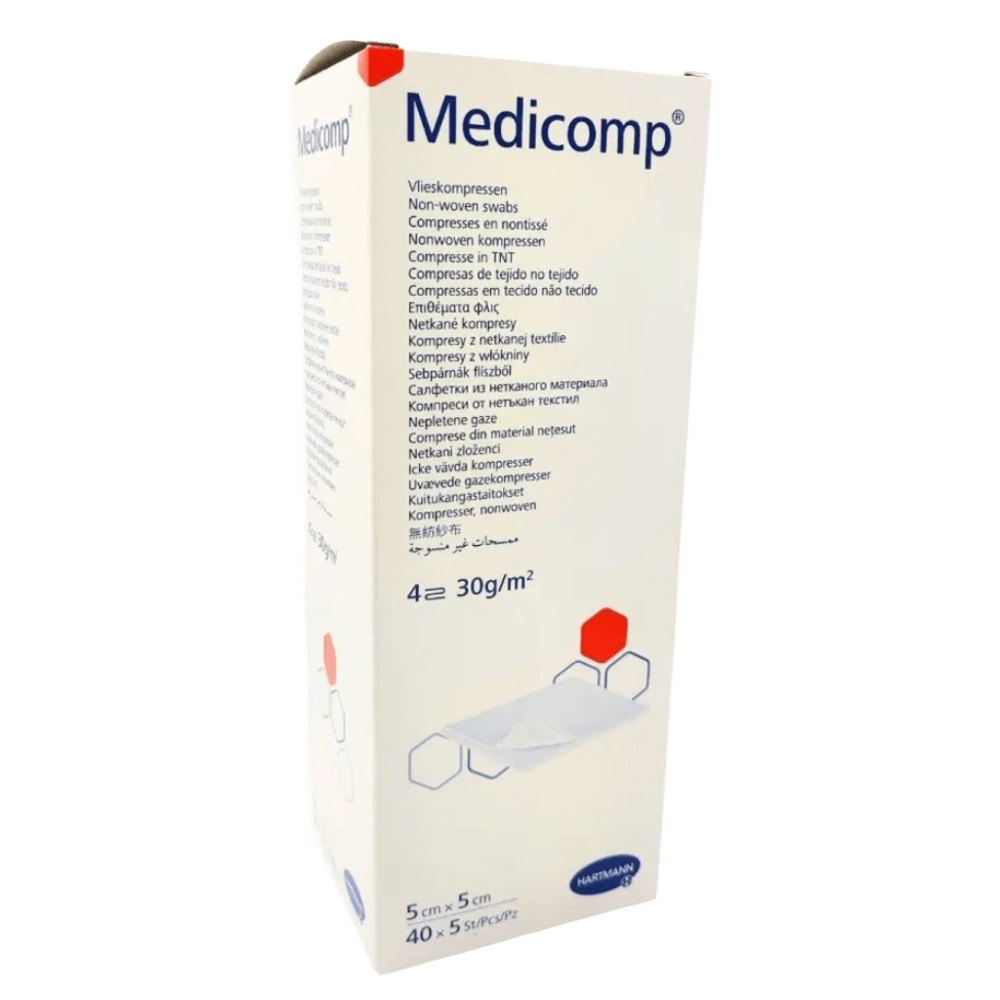 Medicomp Estéril es una compresa estéril no tejida (non-woven), fabricada con una mezcla de 70 % de viscosa y 30 % de poliéster, que ofrece una excelente capacidad de absorción, suavidad y transpirabilidad. Su composición libre de aditivos y blanqueantes ópticos garantiza una alta tolerancia cutánea y una manipulación segura en todo tipo de pieles, incluso las más sensibles. El producto lleva marcado CE, conforme a la Directiva Europea 93/42/CEE y al Real Decreto 1591/2009 sobre productos sanitarios, clasificado como producto sanitario de clase IIa (TÜV 0123). Ha sido sometido a evaluación de conformidad, demostrando su seguridad y rendimiento dentro de los parámetros exigidos por la normativa europea. Características principales: Composición: 70 % viscosa, 30 % poliéster (tejido no tejido – non-woven). Color: Blanco, libre de blanqueantes ópticos y aditivos. Esterilidad: Producto estéril, en envase individual o dispensador (excepto algunas referencias específicas). Presentación: En envase dispensador que facilita la manipulación y extracción aséptica. Clasificación: Producto sanitario clase IIa con marcado CE (TÜV 0123). Uso previsto: Tratamiento general de heridas, curas ambulatorias y pequeñas intervenciones quirúrgicas. Textura: Suave, flexible y no abrasiva, ideal para contacto directo con la piel o zonas lesionadas. Capacidad de absorción: Hasta 70 % más absorbente que una compresa de algodón de 8 capas y 17 hilos. Retiene líquidos sin gotear, liberándolos solo bajo presión. Ventajas del material: Alternativa ideal a las compresas clásicas de algodón. Excelente relación entre suavidad, absorción y resistencia. Transpirable y cómoda para el paciente. Recomendación de uso: Indicada para la limpieza, cobertura y protección de heridas en curas generales, tratamientos ambulatorios y procedimientos menores. Puede emplearse en hospitales, centros de atención primaria y entornos de primeros auxilios. Se recomienda mantener el producto en su envase original hasta su uso para preservar la esterilidad.