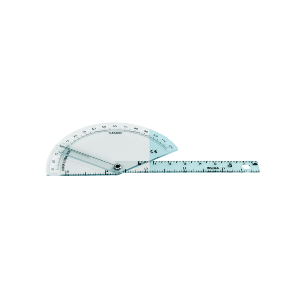 Las características y composición: Goniómetro de 15 cm de longitud fabricado en acero inoxidable de alta calidad, con escala graduada en grados de 0° a 180° en incrementos de 5°, y escala lineal en centímetros en el brazo para mediciones precisas. Ideal para medir la flexión e hiperextensión en articulaciones metacarpofalángicas e interfalángicas de los dedos. Beneficios incluyen precisión, durabilidad y facilidad de lectura. Modo de empleo: Colocar el goniómetro sobre la articulación del dedo a medir, alinear el brazo con los puntos anatómicos relevantes, y leer el ángulo o distancia para evaluación clínica o rehabilitación.