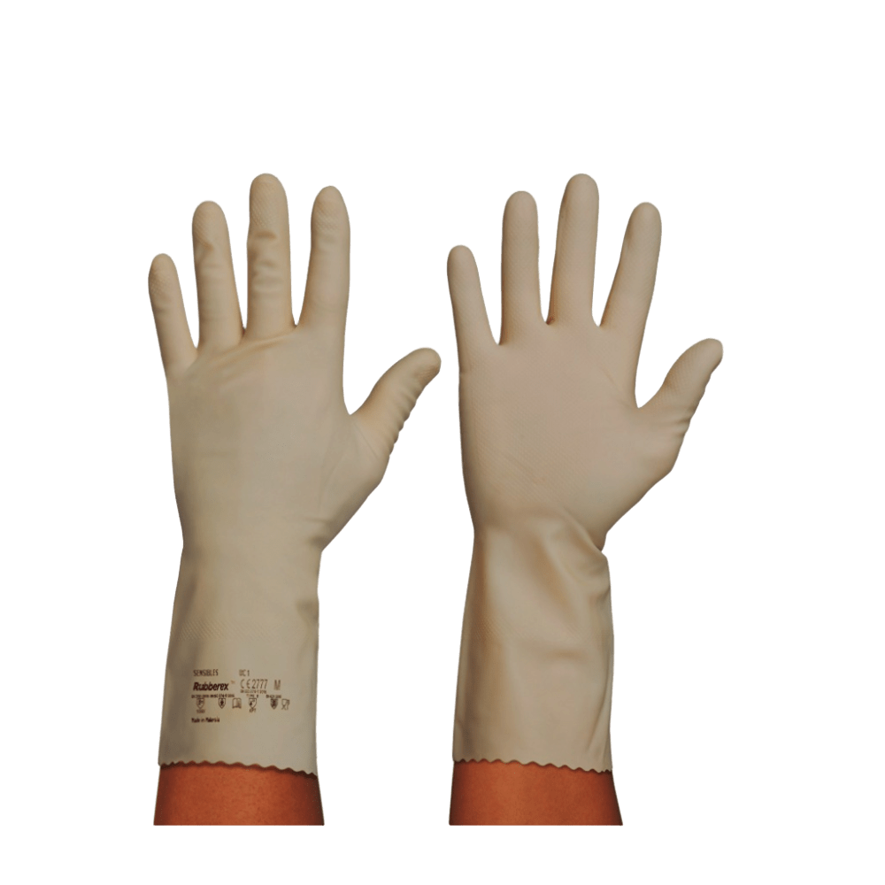 Guante de Menaje Látex Natural Satinado Guante reutilizable de látex natural con interior satinado. Con agarre antideslizante y buena resistencia frente a aceites, grasas y algunos disolventes. No apto para alérgicos al látex.