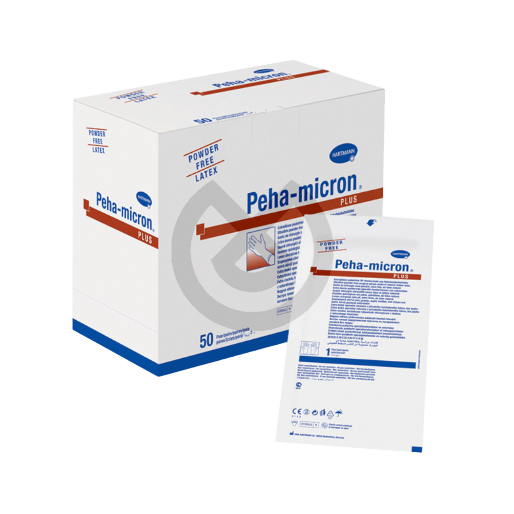 Guantes Quirúrgicos Peha Micron Talla 7 – Látex Estéril sin Polvo (Caja 50 uds) Guantes quirúrgicos de un solo uso, finos y anatómicos. Fabricados en látex natural con recubrimiento de polímero. Alta sensibilidad táctil, microrrugosos, resistentes al desgarro.