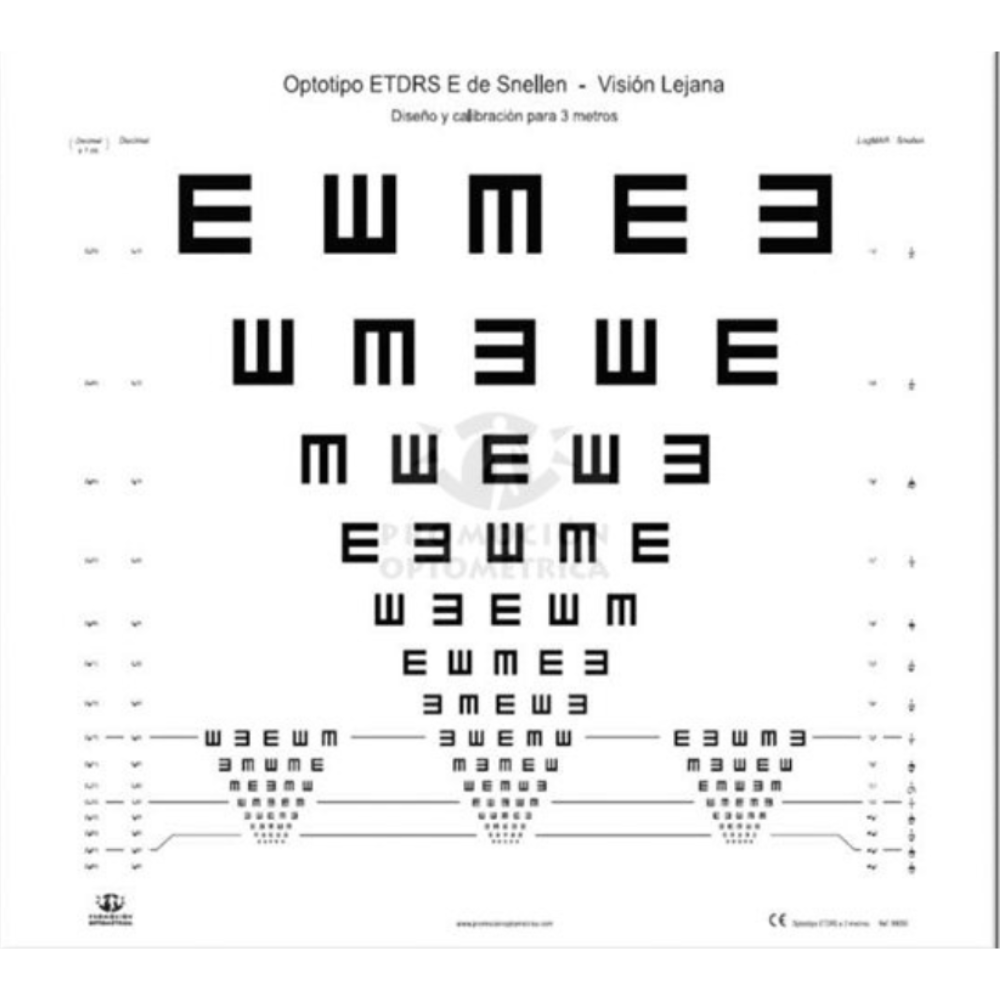 Lámina Optotipo ETDRS E de Snellen – Evaluación precisa de la agudeza visual Optotipo con E de Snellen en las cuatro direcciones, 5 símbolos por línea. Formato profesional de 60 x 50 cm para uso en consulta y estudios visuales.