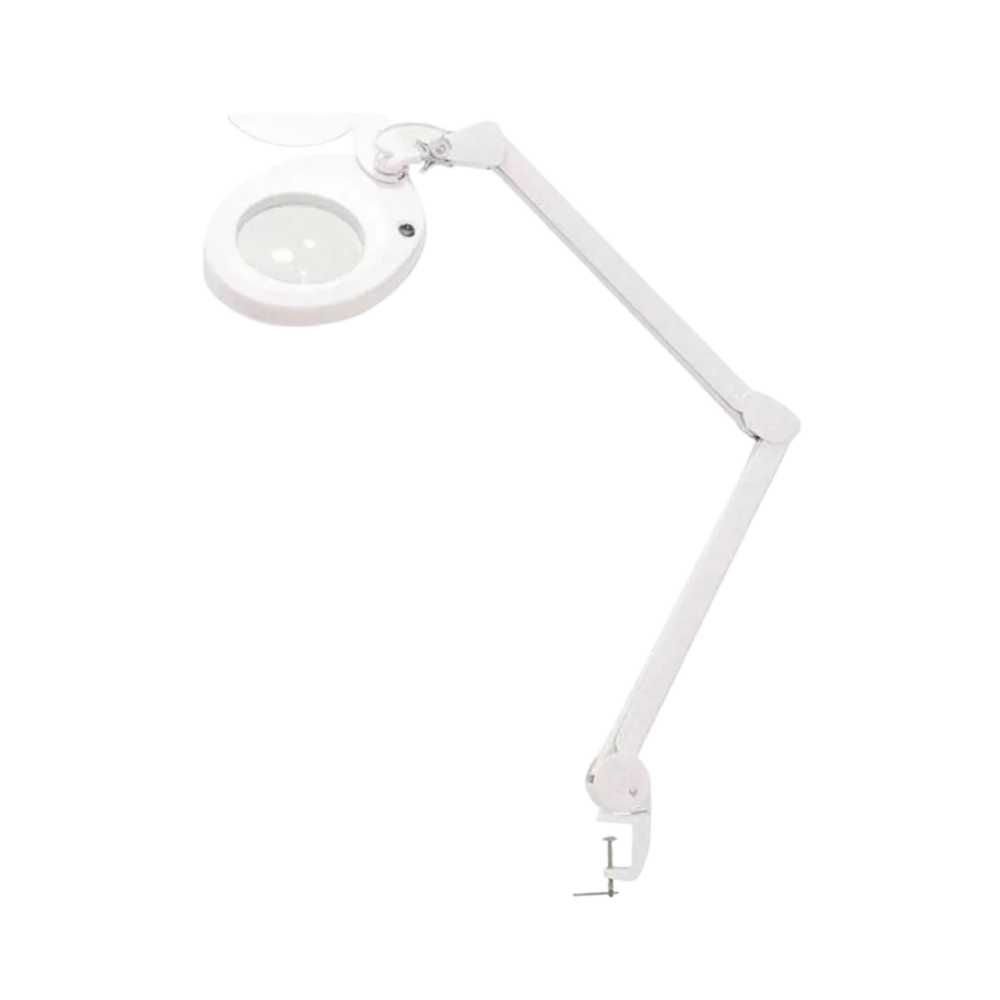 Lámpara lupa LED 5 aumentos con mordaza – Precisión y comodidad profesional Lámpara de luz fría LED con lupa de 5 aumentos, brazo articulado, mordaza de fijación, cabezal regulable y tapa protectora. Bajo consumo y larga vida útil.
