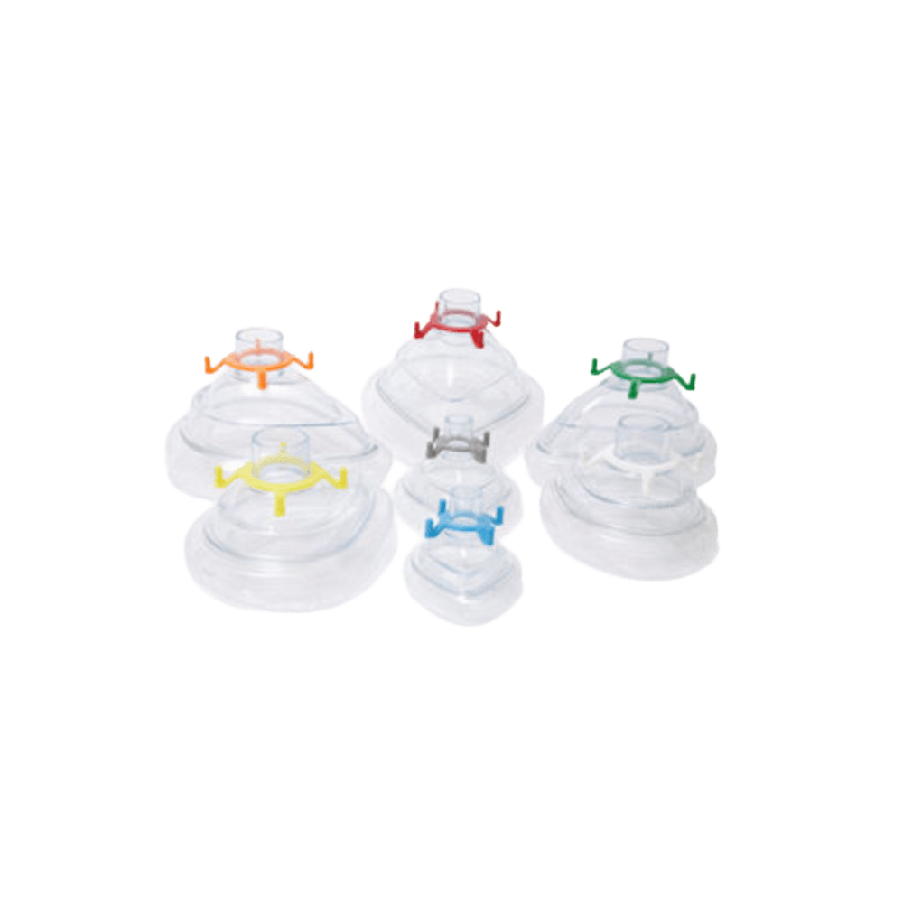 Mascarilla facial para resucitador disponible en silicona esterilizable o PVC desechable, con cámara de aire. Ofrece ajuste anatómico y sellado eficaz. Modelos para neonato, infantil y adulto, numerados del 0 al 5. Uso en emergencias, compatible con equipos de reanimación y resucitadores manuales