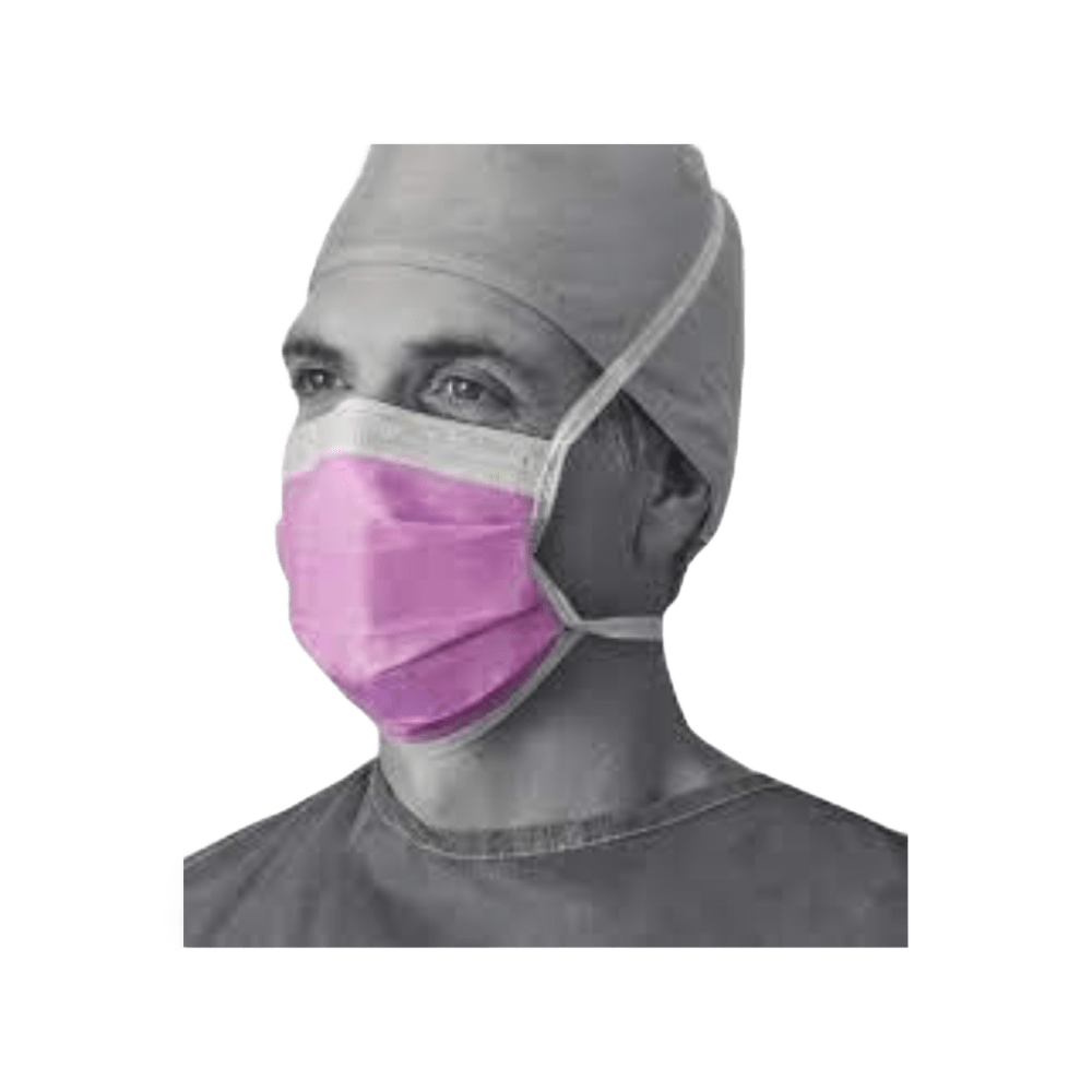 Mascarilla quirúrgica con pantalla y cintas. Mascarilla quirúrgica morada resistente a fluidos, con pantalla integrada y sistema anti-vaho para una protección facial completa y mayor visibilidad en entornos médicos.