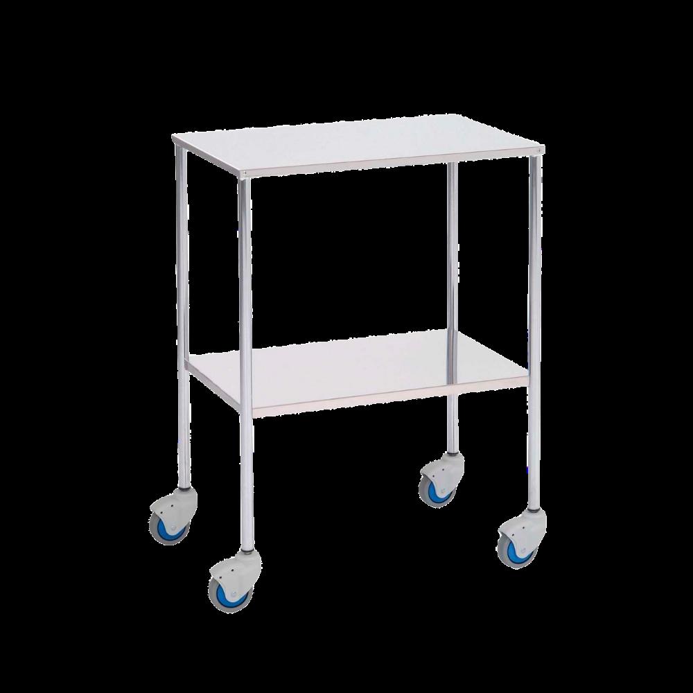 Mesa auxiliar para especialidades médicas – Resistente, funcional y fácil de desplazar Estructura de acero cromado con estantes de acero inoxidable AISI 304, ruedas giratorias con placas antihilos y capacidad de carga hasta 30 kg por estante.