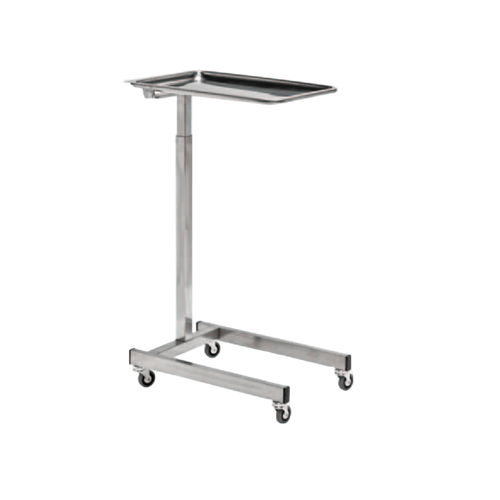 Mesa de mayo inoxidable elevación manual. Carro inoxidable regulable en altura, con bandeja extraíble, ruedas giratorias y capacidad de carga de hasta 10 kg, ideal para transporte seguro y versátil.