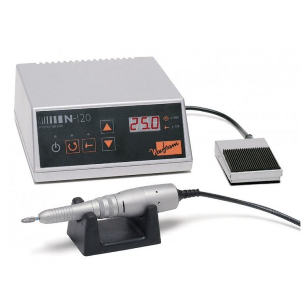 Características principales Velocidad: De 1000 a 25.000 rpm, regulable electrónicamente. Potencia: 120W, según indican distribuidores como ComraShop. Pieza de mano: Diseño ergonómico y ligero. Sistema de cambio rápido por cuarto de vuelta. Pinzas intercambiables, incluyendo una de origen de Ø 2,35 mm, que permiten trabajar con accesorios de diferentes diámetros (de 0 a 3,2 mm). Protección: Cuenta con triple protección antipolvo en el cojinete delantero para una mayor durabilidad. Funciones: Control electrónico de velocidad y par de potencia. Capacidad de giro a derecha e izquierda (reversible). Sistema de protección automático contra sobrecarga. Pedal de control (marcha/paro) incluido para una operación manos libres. Indicadores: Su unidad de control incluye un visor digital luminoso que muestra las revoluciones por minuto. Versatilidad: Puede utilizarse con una pieza de mano martillo automática para engaste de piedras. Usos principales El micromotor Navfram N-120 es adecuado para los siguientes trabajos: Joyería y orfebrería: Para tareas de precisión, grabado y pulido. Protésicos dentales: Para acabados y retoques en prótesis. Podología y estética: Para el cuidado y pulido de uñas y otros tratamientos. Talleres de óptica y mecánica ligera: Para trabajos detallados en materiales diversos.