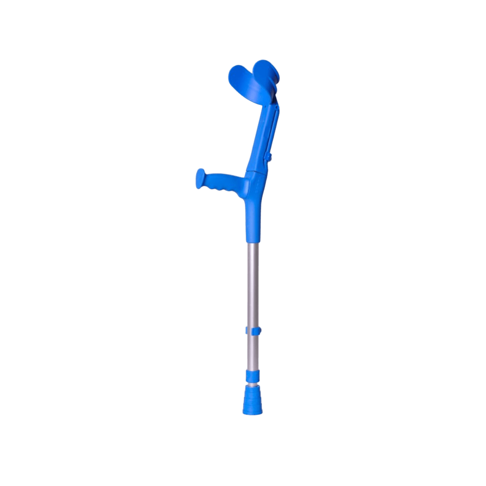 Muleta Infantil Azul Regulable Muleta infantil fabricada en aluminio y termoplástico, con ajuste de altura y codo en múltiples posiciones. Diseño ergonómico para mayor comodidad y seguridad.