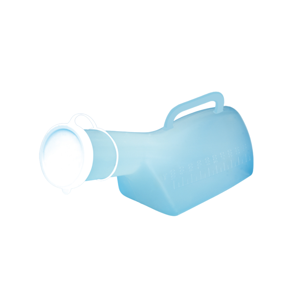Orinal masculino – Práctico, resistente y fácil de desinfectar Tipo botella con mango. Calibrado exterior para control de capacidad. Resistente, fácil de lavar y apto para autoclave.