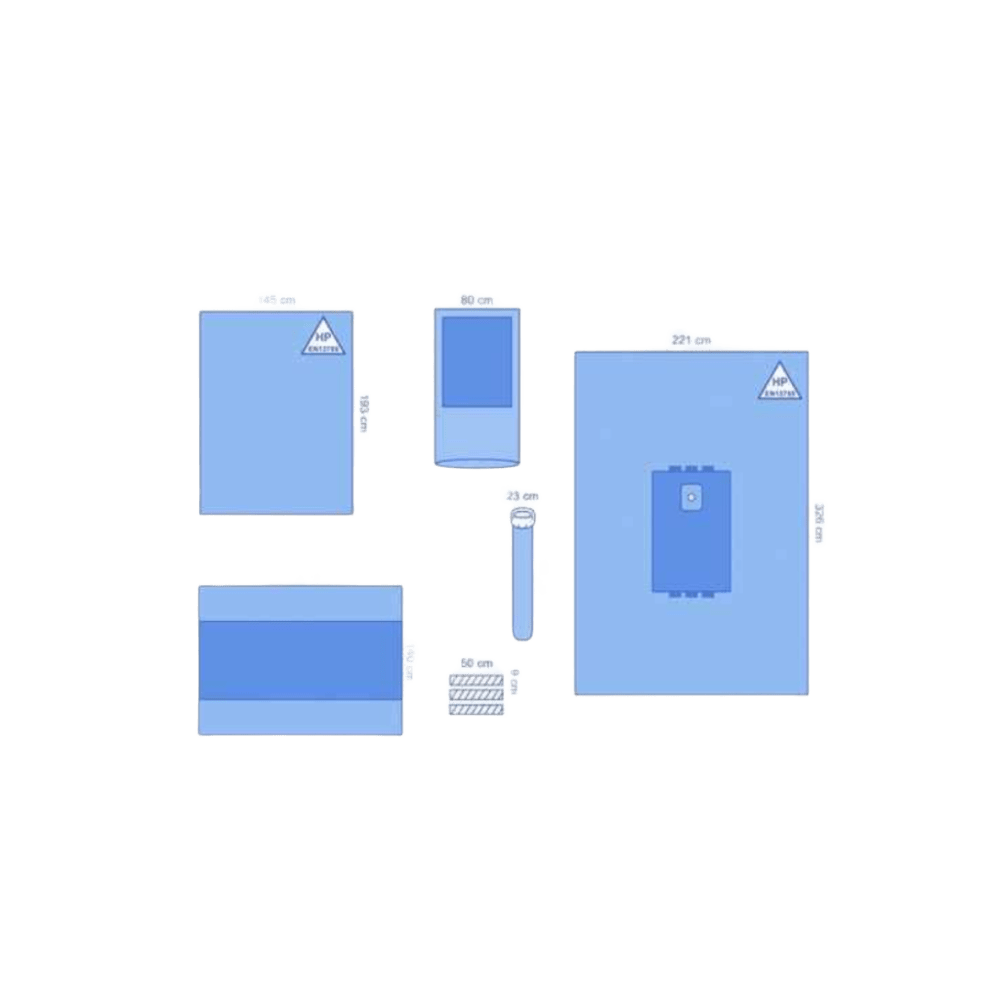 Equipo de Extremidades Quirúrgico – Cobertura completa y estéril Kit estéril diseñado para procedimientos en extremidades. Incluye sábana trilaminar con fenestración, stockinette impermeable, cintas adhesivas y funda de mesa.