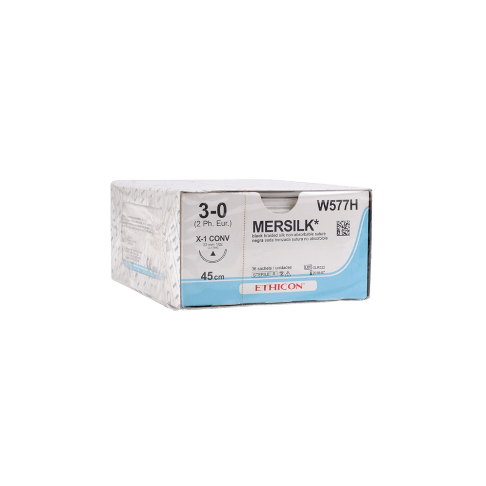 Las suturas MERSILK™ de ETHICON son hilos quirúrgicos no absorbibles, fabricados con seda natural trenzada y recubiertos para mejorar su manejo, reducir la fricción con los tejidos y disminuir la capilaridad. Están indicadas para la aproximación o ligadura de tejidos blandos en procedimientos quirúrgicos generales. Estas suturas se presentan teñidas de color negro para ofrecer una mejor visibilidad durante la cirugía. Están disponibles en una variedad de calibres (como 2/0, 3/0 y 4/0), diferentes longitudes (45 cm, 75 cm, 90 cm), y con agujas curvas triangulares (1/2 o 3/8 de circunferencia), en tamaños como 16 mm, 19 mm, 22 mm y 26 mm, adaptándose así a distintas necesidades quirúrgicas. Aunque no son absorbibles, las suturas de seda MERSILK pueden degradarse lentamente en el cuerpo debido a procesos proteolíticos, por lo que no se recomienda su uso en tejidos sometidos a tensión prolongada o donde se requiere soporte permanente. - Características generales de MERSILK™ – ETHICON: • Fabricante: ETHICON (Johnson & Johnson). • Tipo: No absorbible, trenzada, recubierta. • Material: Seda natural. • Color: Negra (teñida para visibilidad intraoperatoria). • Calibres disponibles: 2/0, 3/0, 4/0. • Longitudes comunes: 45 cm, 75 cm, 90 cm. • Agujas: Curvas triangulares (3/8 y 1/2 de circunferencia), tamaños de 16 mm a 26 mm. • Presentación: Cajas de 36 unidades estériles. • Uso indicado: Ligadura o cierre de tejidos blandos. • Ventajas: Buena manipulación, anudado seguro, excelente visibilidad. • Limitaciones: No indicada para tejidos con tensión a largo plazo. • Proceso de degradación: Puede sufrir degradación en el cuerpo por acción proteolítica, aunque no es absorbible.