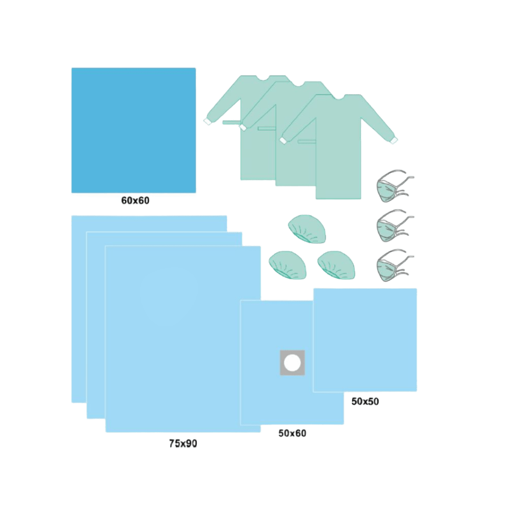 Set Dental Plus – Kit completo de protección para intervenciones odontológicas Set de cobertura quirúrgica para tratamientos dentales. Incluye paños, batas, mascarillas y gorros. Caja de 12 unidades.