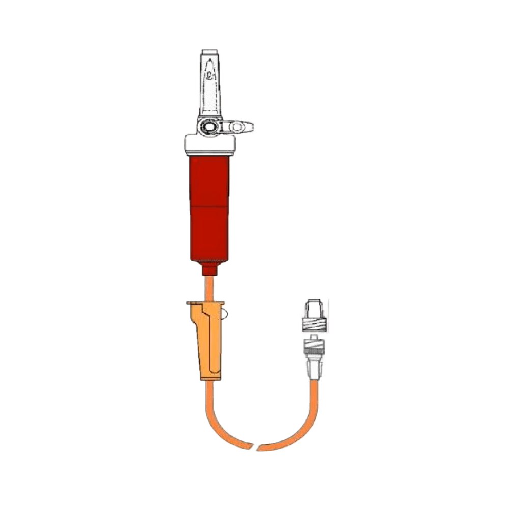 Características y composición: Este sistema es un equipo de administración de soluciones para bombas de infusión. Está compuesto por un tapón protector de perforador, un perforador bicanal ergonómico con toma de aire, una cámara en PE opaca naranja flexible que permite observar el goteo y tiene filtro de 15μm. El tubo en PVC opaco naranja está libre de ftalatos y DEHP con 230 cm de longitud. Incluye un roler de alta precisión para controlar flujo y un luer lock macho móvil adaptable con tapón protector con filtro purga hidrófugo para evitar goteos y contaminación. Modo de empleo: Colocar el sistema en la bomba de infusión, conectar a la bolsa de solución y asegurar el control de flujo con el roler para mantener vía permeable y segura durante la administración.