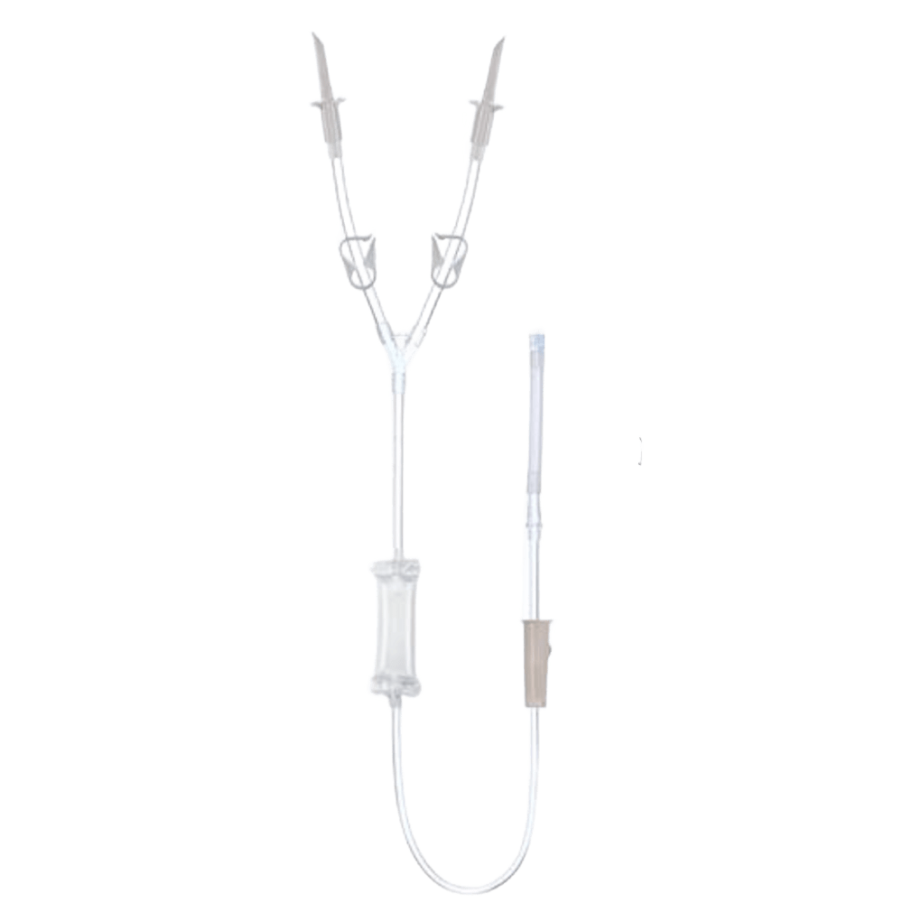 Equipo de Irrigación Urológica “URO-23” – Dos Vías en Y para Cistoscopia Sistema de irrigación por gravedad con doble vía en Y, adaptado para procedimientos urológicos. Tubo de 230 cm de gran caudal, cámara de goteo flexible y adaptador para cistoscopio.