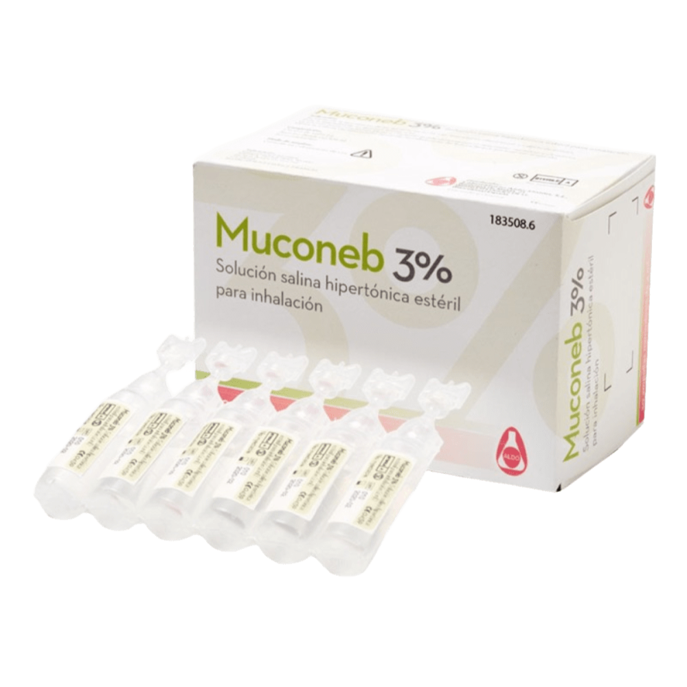 SUERO MUCONEB 3 % SOLUCION SALINA 30 AMPOLLAS - UNIDAD Solución salina Muconeb al 3% en formato de 30 ampollas monodosis, ideal para la humidificación y limpieza de las vías respiratorias. Unidad.