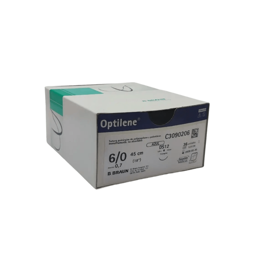 La sutura Optilene® de B. Braun es una sutura quirúrgica no absorbible, de estructura monofilamento, fabricada principalmente con polipropileno (y en algunos casos polipropileno/polietileno) lo que le aporta ciertas propiedades claves. Características técnicas y ventajas principales: Alta resistencia tensil: mantiene un nivel muy consistente de fuerza mecánica, lo cual es crítico en tejidos sometidos a tensión como en cirugía vascular o cardíaca. Superficie muy lisa y uniforme del hilo: facilita el paso por los tejidos, minimizando trauma. Elasticidad mejorada y elongación controlada: permite que el hilo tenga un cierta flexibilidad sin perder su forma, lo que es relevante en tejidos dinámicos. Mayor flexibilidad, mejor visibilidad del hilo (normalmente de color azul para facilitar su identificación), reducción del efecto “curling” del hilo, y mínimo “efecto memoria” gracias al envasado especial (“RacePack”) que ayuda a que el hilo mantenga su configuración óptima. Estructura: monofilamento sin recubrimiento.