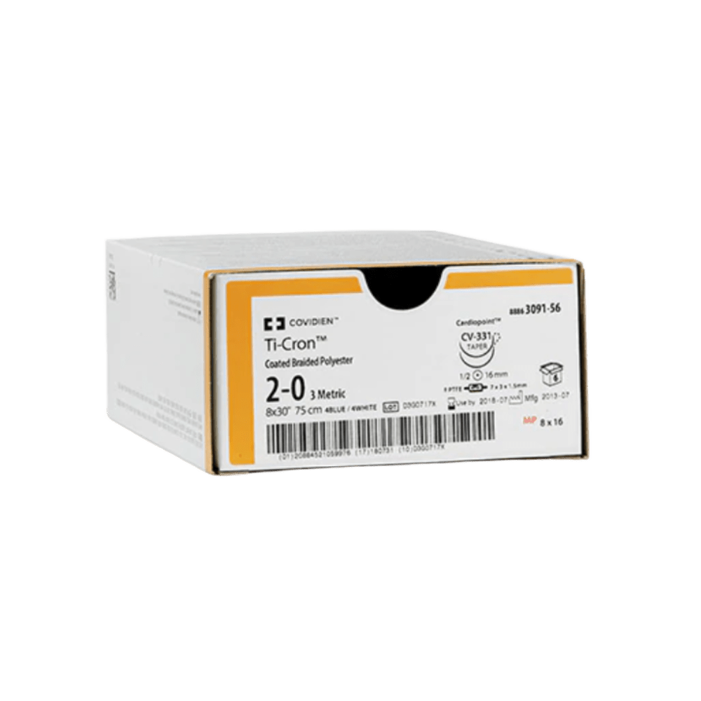 Ti-cron™ – Sutura Sintética No Absorbible Trenzada de Poliéster Máxima seguridad y durabilidad para tejidos sometidos a tensión Ti-cron™ es una sutura quirúrgica sintética, no absorbible y trenzada, elaborada con tereftalato de polietileno de cadena lineal larga y alto peso molecular. Está diseñada para ofrecer una resistencia mecánica prolongada y confiable, siendo ideal para procedimientos donde se requiere una fijación segura y permanente, como en cirugía cardiovascular, oftálmica y neurológica. Gracias a su recubrimiento uniforme de silicona, Ti-cron™ mejora la lubricidad de la superficie, facilitando su paso por los tejidos, reduciendo el trauma y asegurando una excelente capacidad de anudado. Características y beneficios: • Composición de poliéster de alta tenacidad • Trenzado con recubrimiento de silicona que mejora el manejo y la facilidad de paso • Alta resistencia tensil y excelente seguridad en el nudo • No absorbible: retiene su fuerza indefinidamente • Mínima reacción inflamatoria aguda, con encapsulación progresiva • Disponible en color azul o blanco • Presentación estéril, en hebras o carretes, con o sin aguja • Diversas configuraciones de aguja y calibres (de 5 a 7-0) .