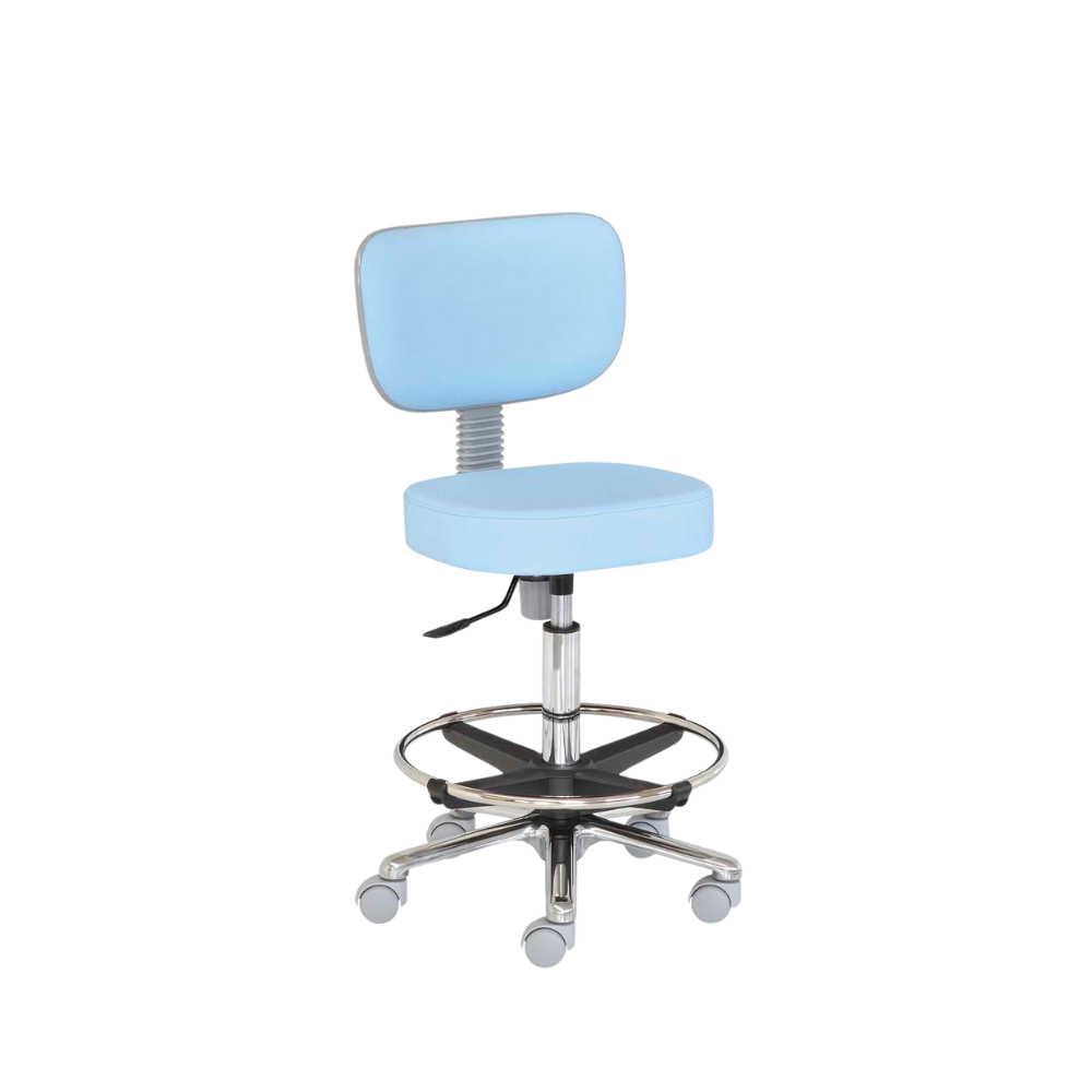 Taburete giratorio bajo – Estabilidad, confort y ajuste ergonómico Asiento y respaldo acolchados, regulable en altura, con aro reposapiés ajustable y base de aluminio. Máxima comodidad en espacios de trabajo reducidos.