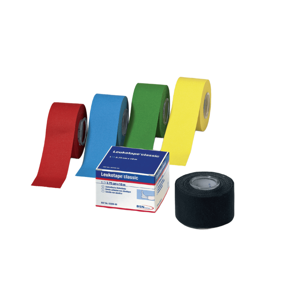 Cinta Adhesiva Inelástica de Colores Especial para vendajes funcionales (Taping). Disponible en azul, rojo, verde, amarillo y negro. Envase individual.