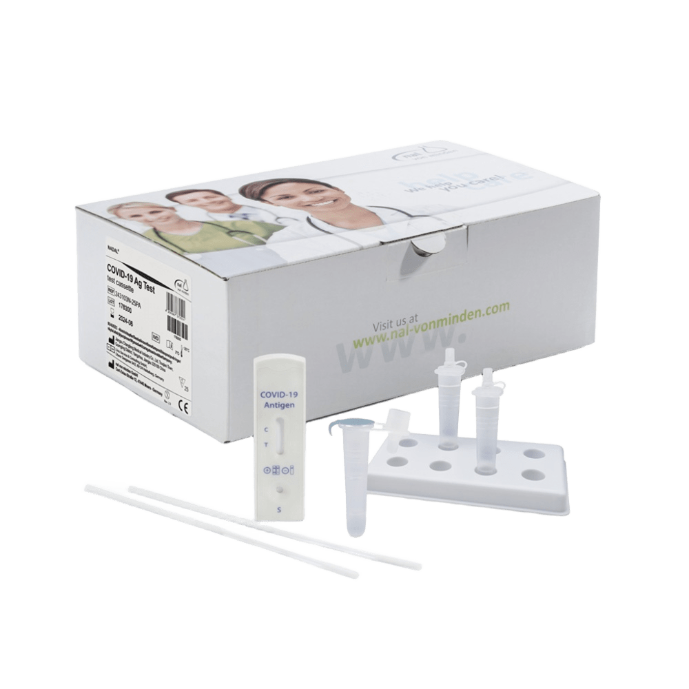 Test rápido de antígeno NADAL® COVID-19 Ag en formato cassette, para detección cualitativa del antígeno nucleoproteico de SARS-CoV-2 en muestras nasales, nasofaríngeas u orofaríngeas. Incluye hisopos estériles y tubos con buffer precargado. Sensibilidad del 97,56% y especificidad superior al 99,9%. Resultados fiables en 15 minutos, detecta todas las variantes conocidas. Caja de 25 unidades, uso profesional, CE-IVD certificado
