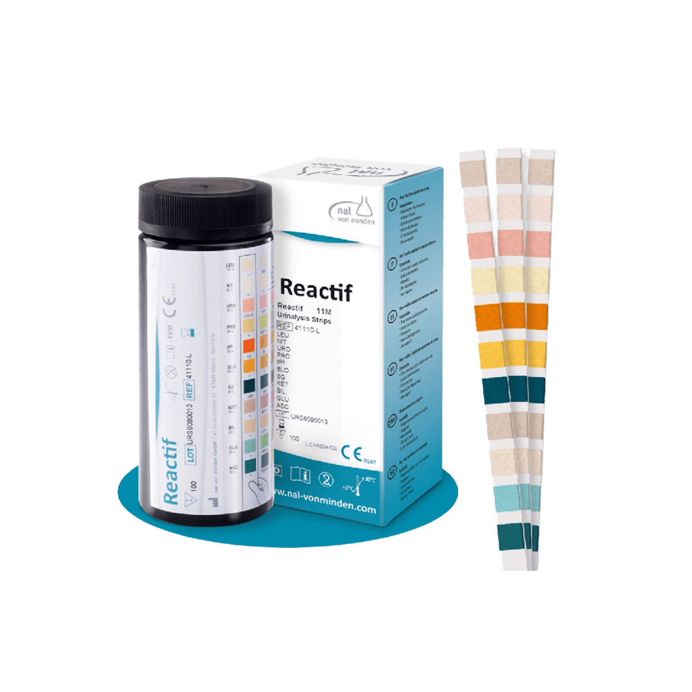 Tiras reactivas de orina Reactif 11M para detección cualitativa y semicuantitativa de 11 parámetros: ácido ascórbico, glucosa, bilirrubina, cetonas, gravedad específica, sangre, pH, proteínas, urobilinógeno, nitrito y leucocitos. Resultados en minutos, alta sensibilidad, fácil lectura visual o automática. Solo para uso profesional, caja de 25 unidades, recomendadas para diagnóstico y control en laboratorios y consultas